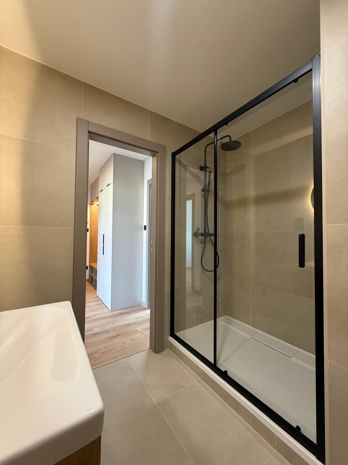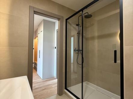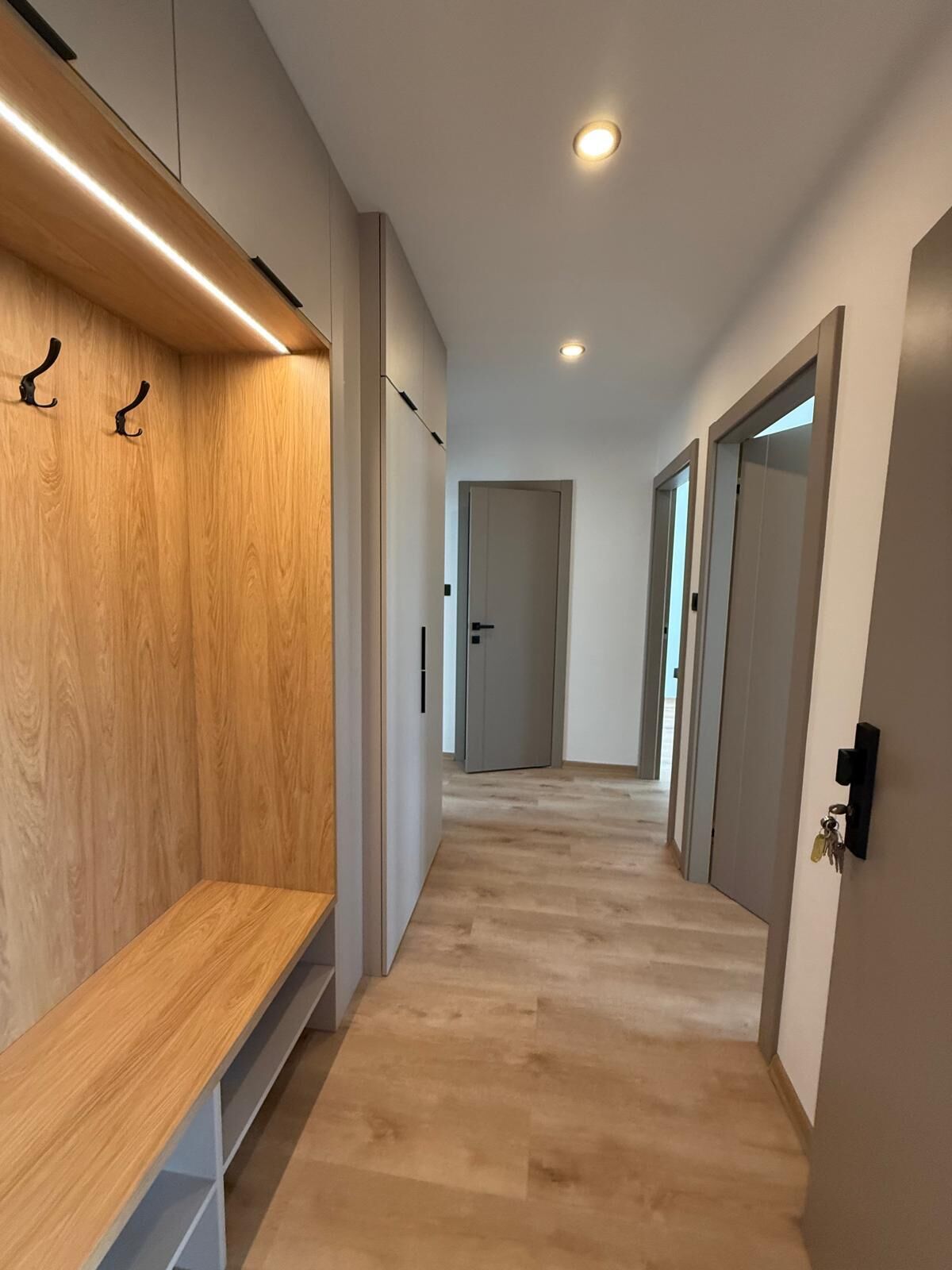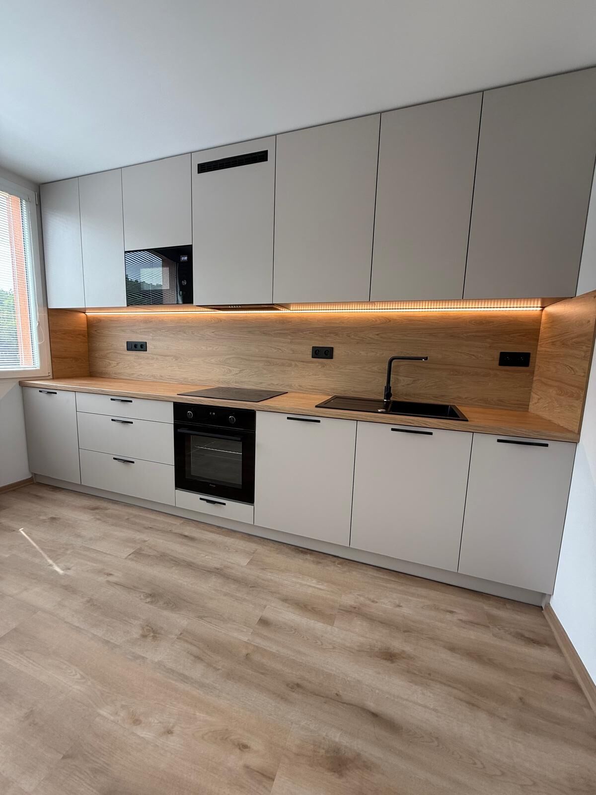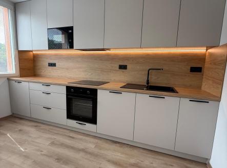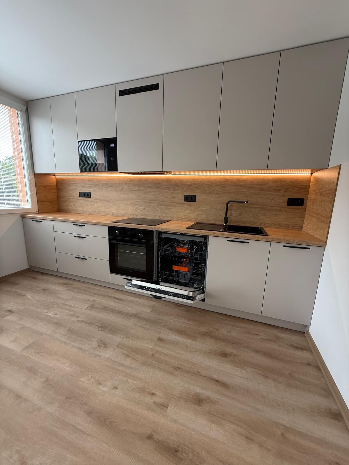 V bytě je vše nové, nové podlahy, nová koupelna, nová kuchyňská linka, nová světla, vypínače, bezfalcové dveře s obložkami. Celý interiér je pečlivě sladěný do nejmenšího detailu a zároveň každý detail je důležitý. Bezesporu největší dominantou bytu je kuchyňská linka s vestavěnými spotřebiči a vestavěná šatní skříň v chodbě. Vše bylo vyrobeno na míru pro tuto bytovou jednotku tak, aby se Vám zde příjemně bydlelo.