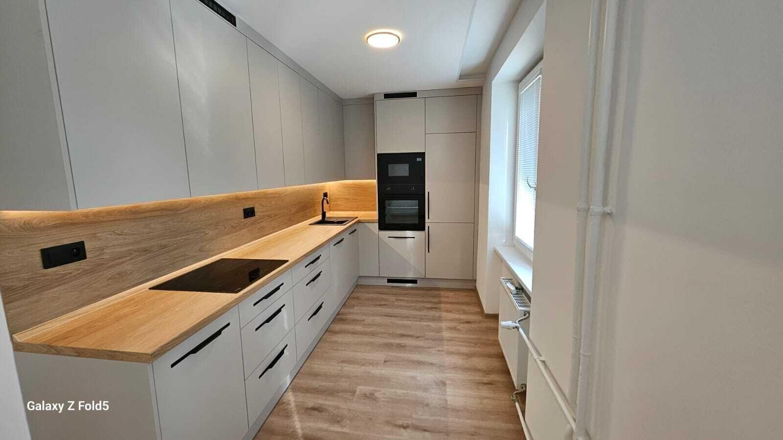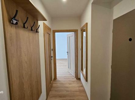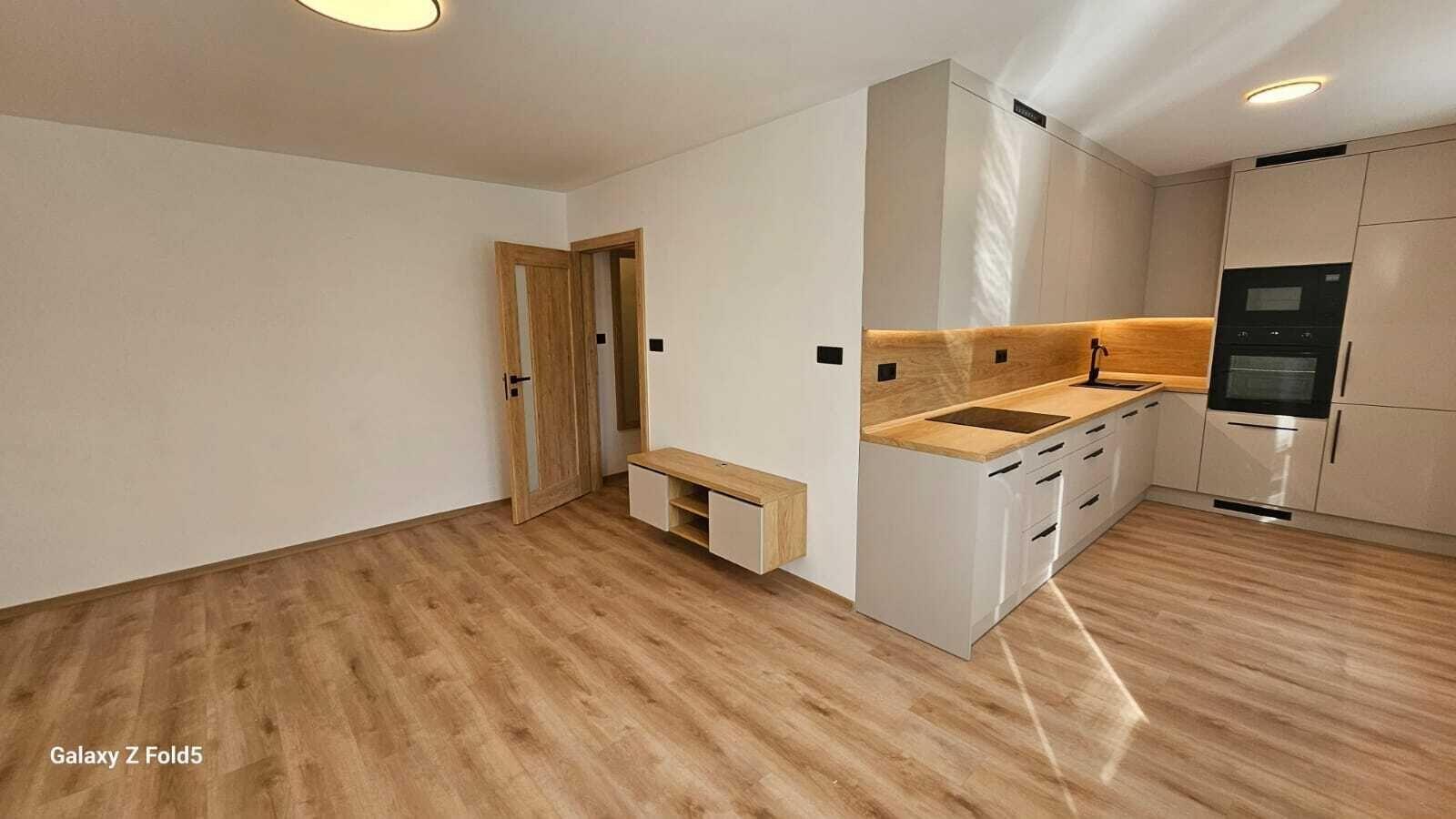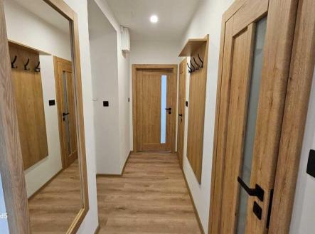 V bytě je vše nové, nové podlahy, nová koupelna, nová kuchyňská linka, nová světla, vypínače, bezfalcové dveře s obložkami. Celý interiér je sladěný do nejmenšího detailu a zároveň každý detail je důležitý. Bezesporu největší dominantou bytu je kuchyňská linka s vestavěnými spotřebiči a vestavěná šatní skříň v chodbě. Vše bylo vyrobeno na míru pro tuto bytovou jednotku.