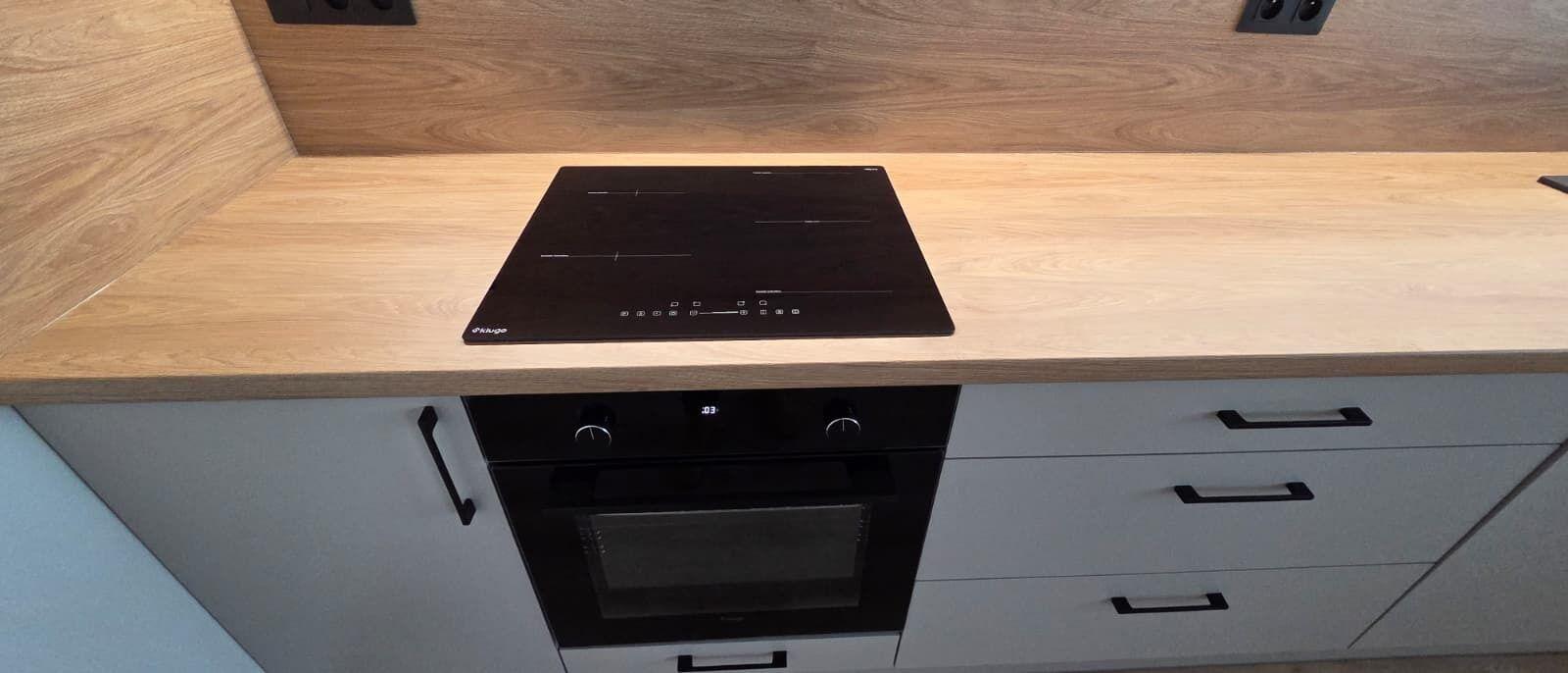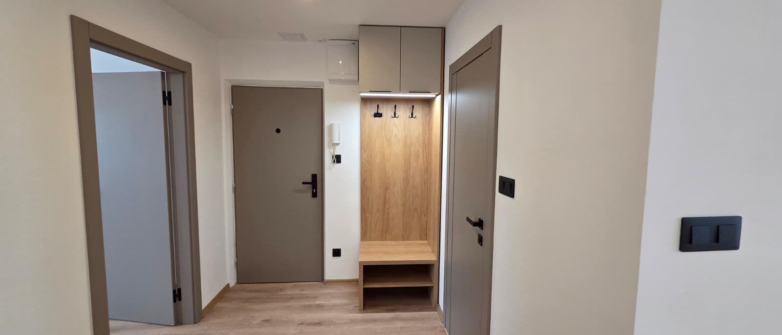V bytě je vše nové, nové podlahy, nová koupelna, nová kuchyňská linka, nová světla, vypínače, bezfalcové dveře s obložkami. Celý interiér je sladěný do nejmenšího detailu a zároveň každý detail je důležitý. Bezesporu největší dominantou bytu je kuchyňská linka s vestavěnými spotřebiči, v chodbě na míru udělána vestavěná skříň a botník, vše bylo vyrobeno přímo na míru této bytové jednotky.